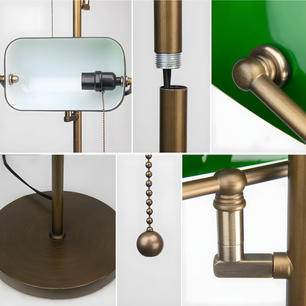 Le corps métallique est conçu pour résister à la corrosion et conserver sa finition brillante dans le temps. L’abat-jour en verre vert épais est poli pour résister à la décoloration et garantir une diffusion lumineuse uniforme. Chaque détail est pensé pour une lampe durable, pratique et visuellement élégante qui garde son éclat année après année.